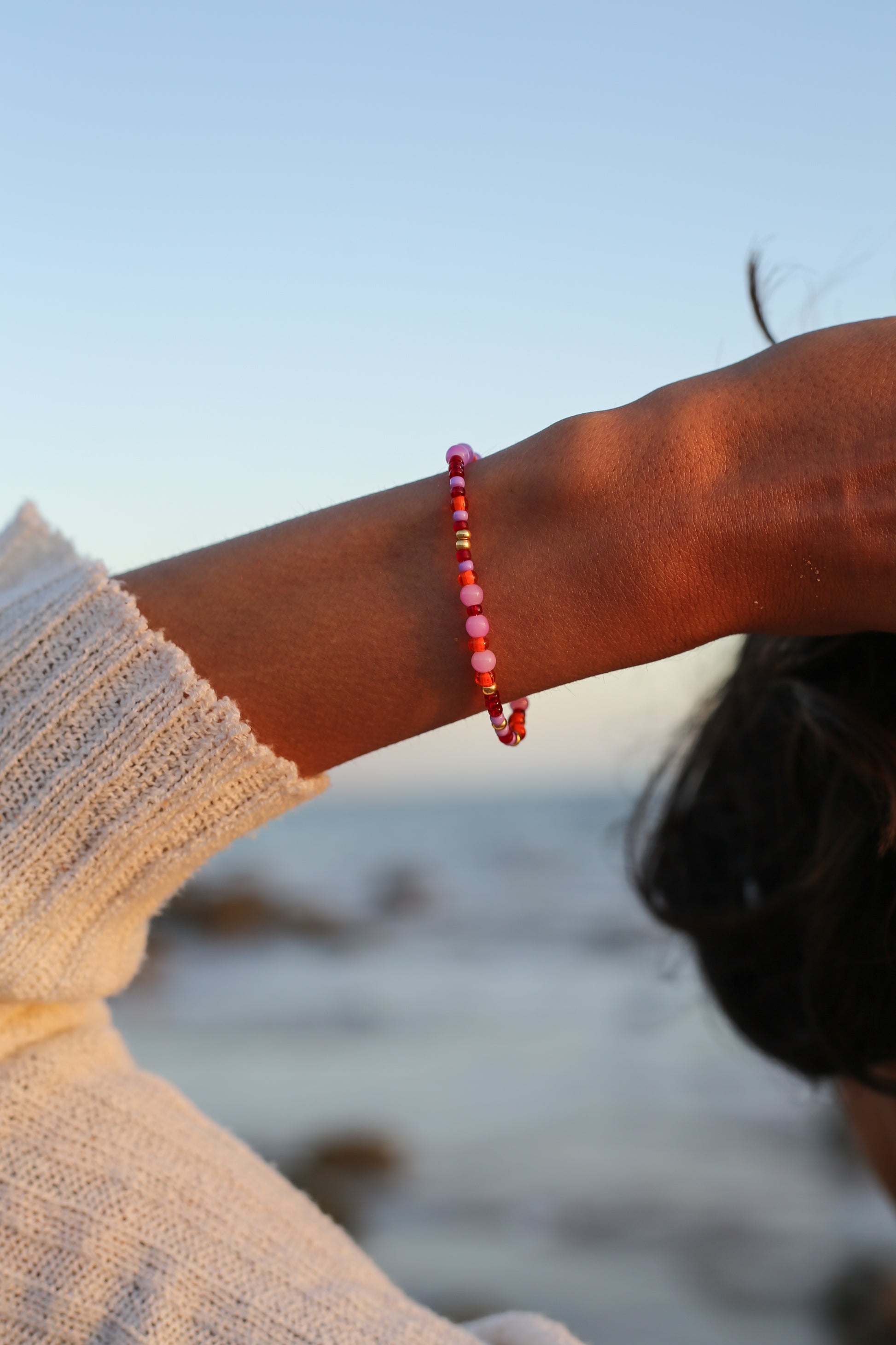 Beautiful colorful beaded bracelet made on an elastic cord. This cute bracelet is perfect for stacking with other gold or silver chain bracelets. Features lovely red, pink, orange, and purple tones. High Quality beads.