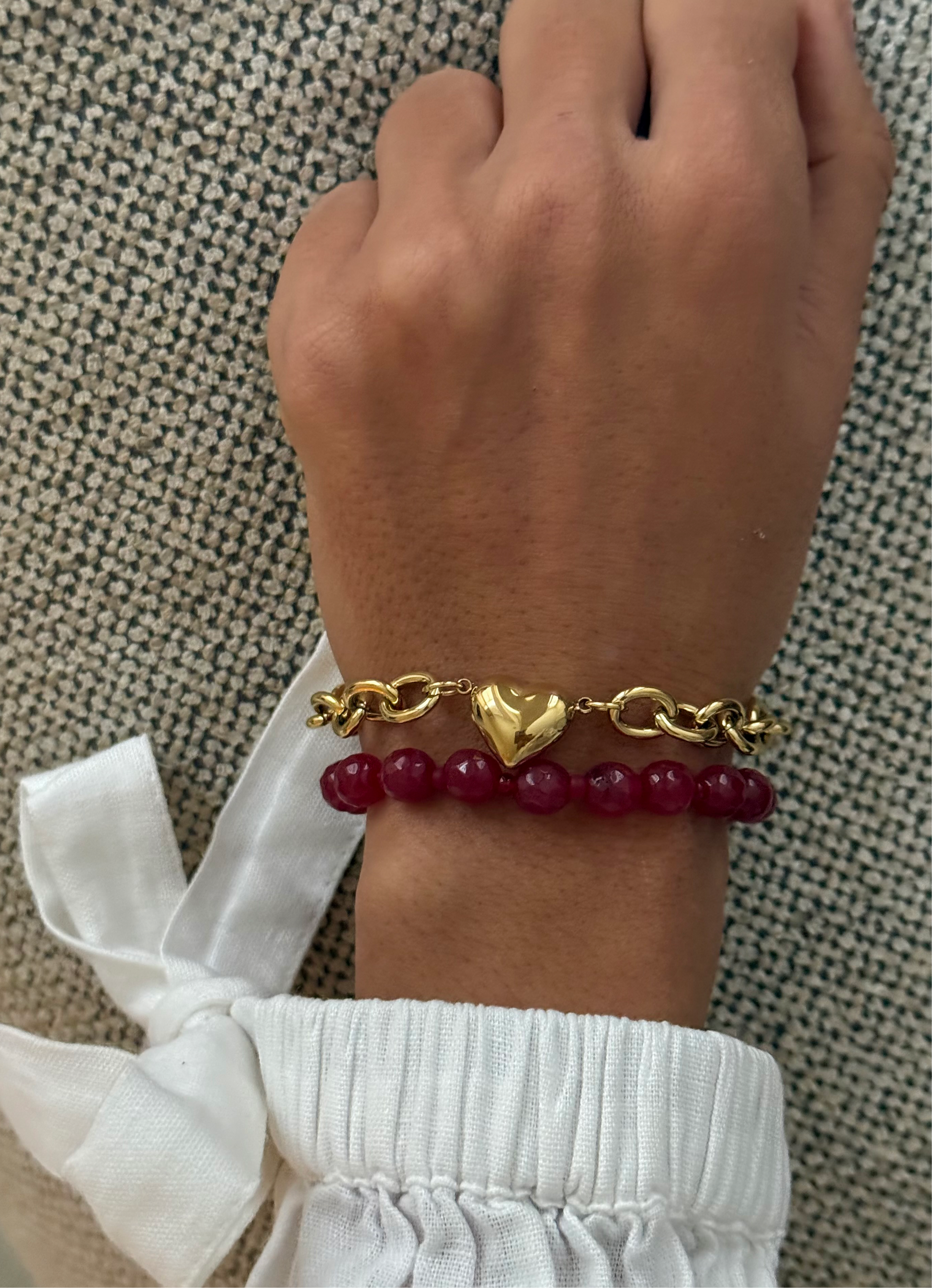 This cute cherry bracelet is made of natural stones mixed with beads in between. It’s without a lock so super easy to slide on and off.