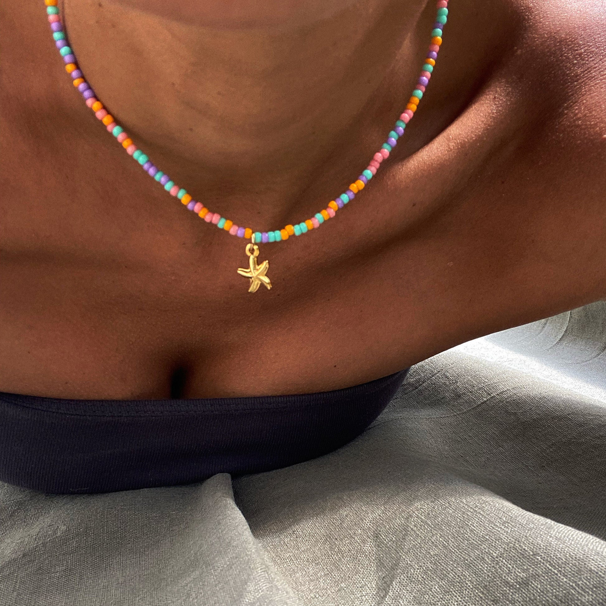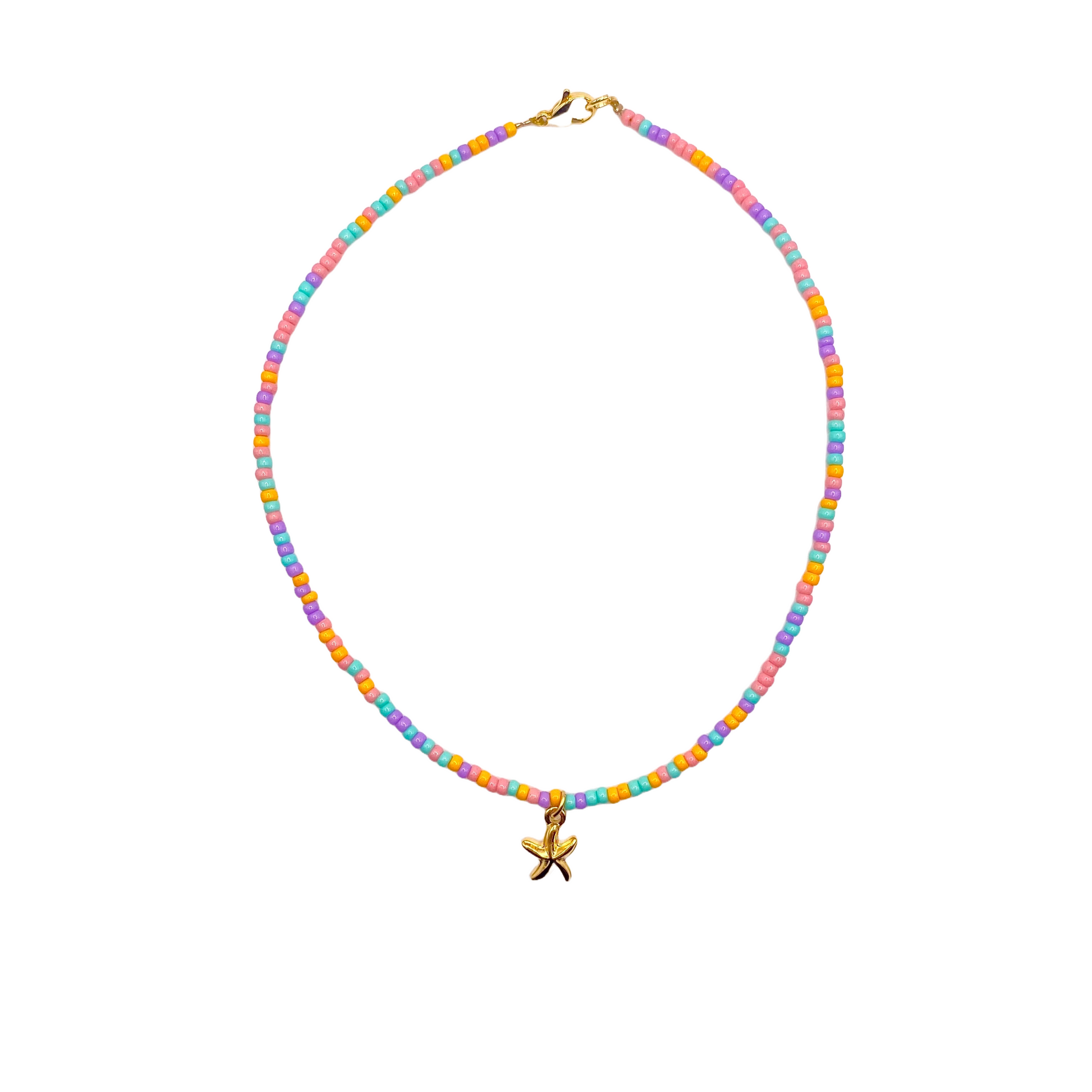 This necklace is designed to be worn shorter and features a cute range of colorful beads with a gold-toned stainless steel starfish at its center. It’s perfect for layering with longer necklaces. An adjustable extension chain is also included, so you can choose just the right length.