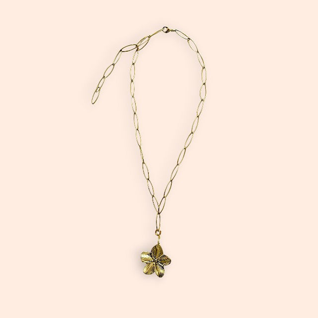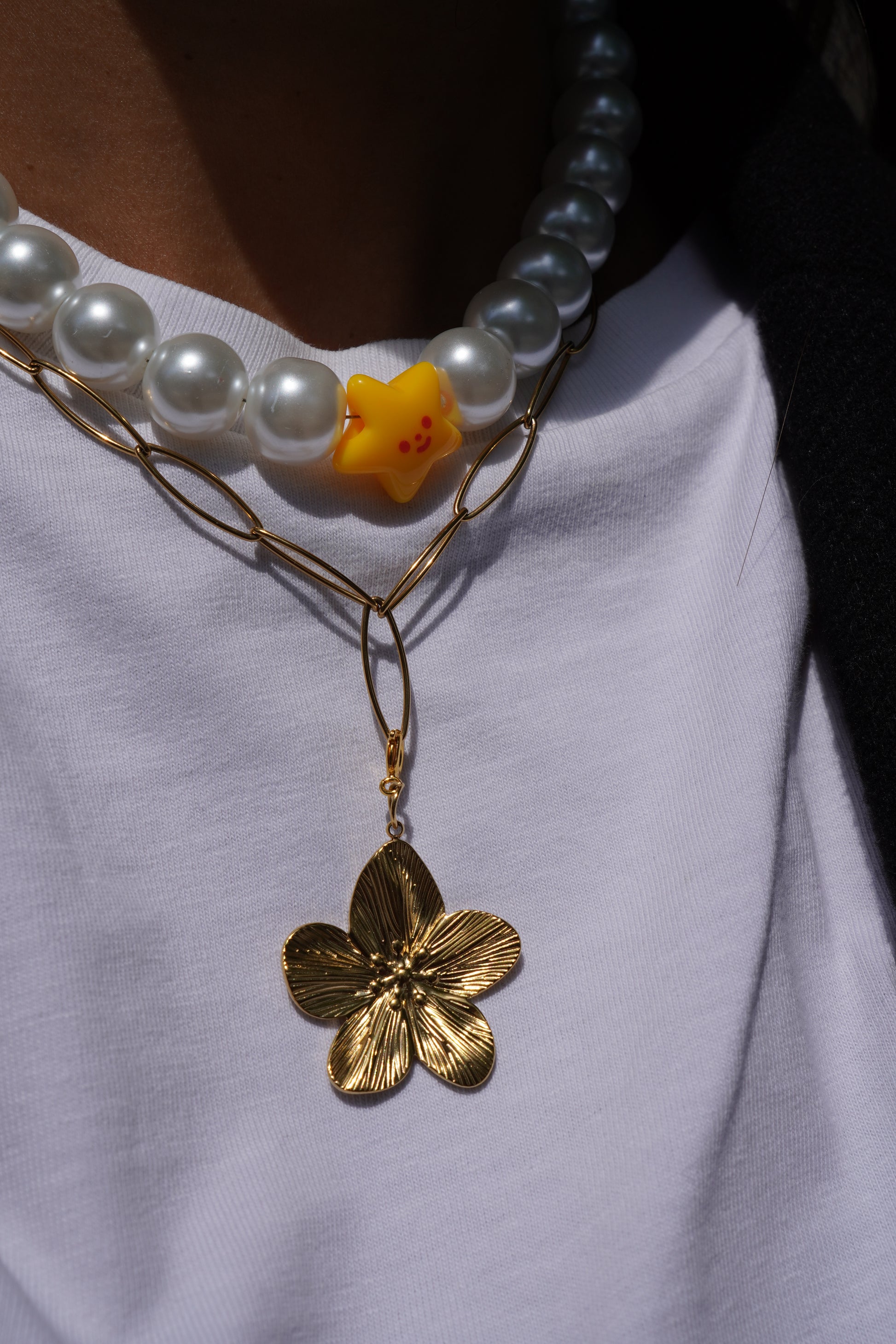 The Golden Flower Necklace, is made of a stainless steel chain with an eye catching flower pendant. Easy to pair with other pieces, and a great choice for any season.
