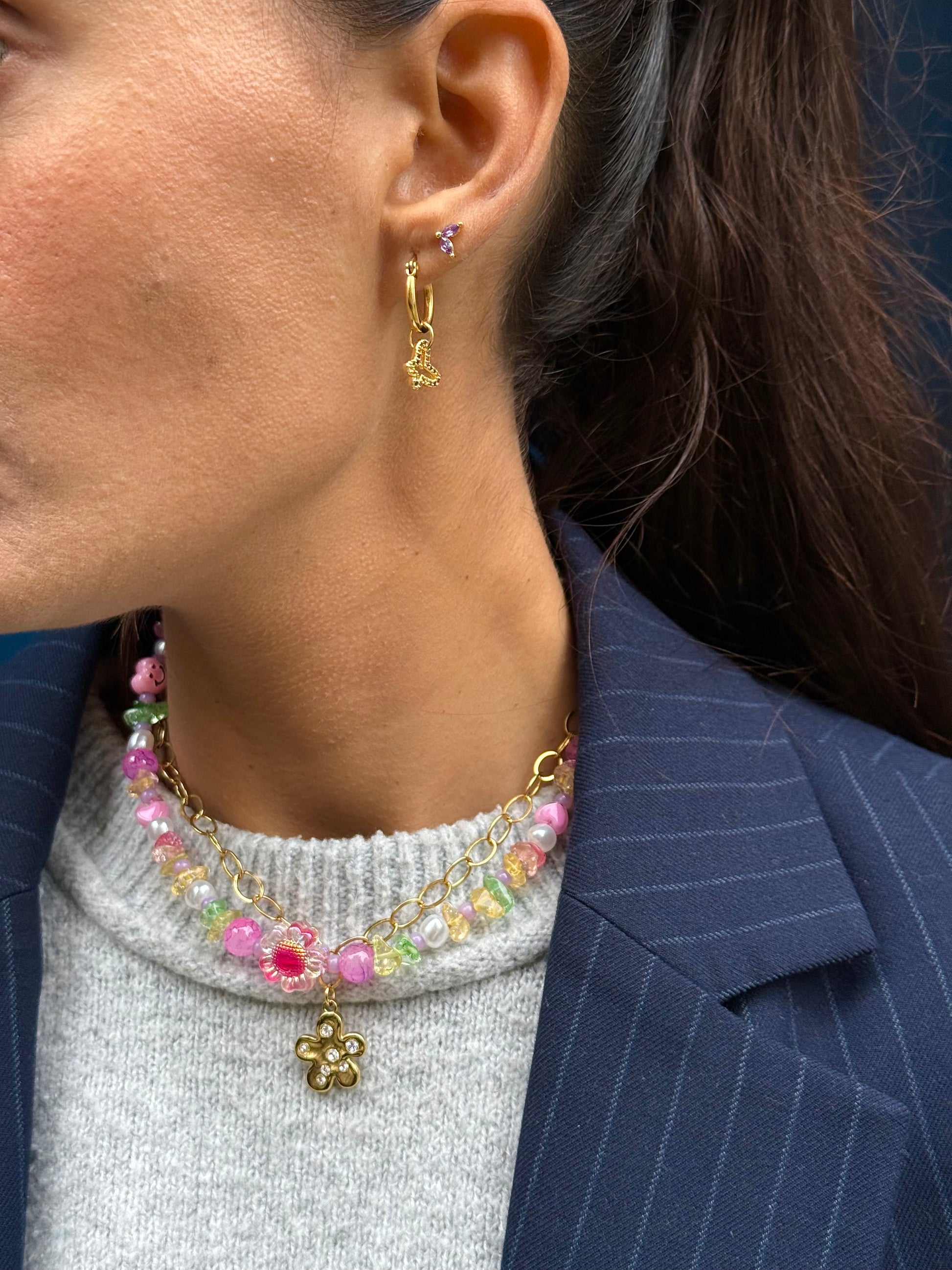 This beautiful necklace, featuring a beautiful mix of freshwater pearls, glass beads, natural pearls, gemstone flakes, and charming heart and flower beads. This necklace is secured with a stainless steel clasp that has a gold plating and includes an extension chain for adjustable length. It’s perfect for wearing slightly shorter, allowing you to layer it beautifully with longer necklaces.