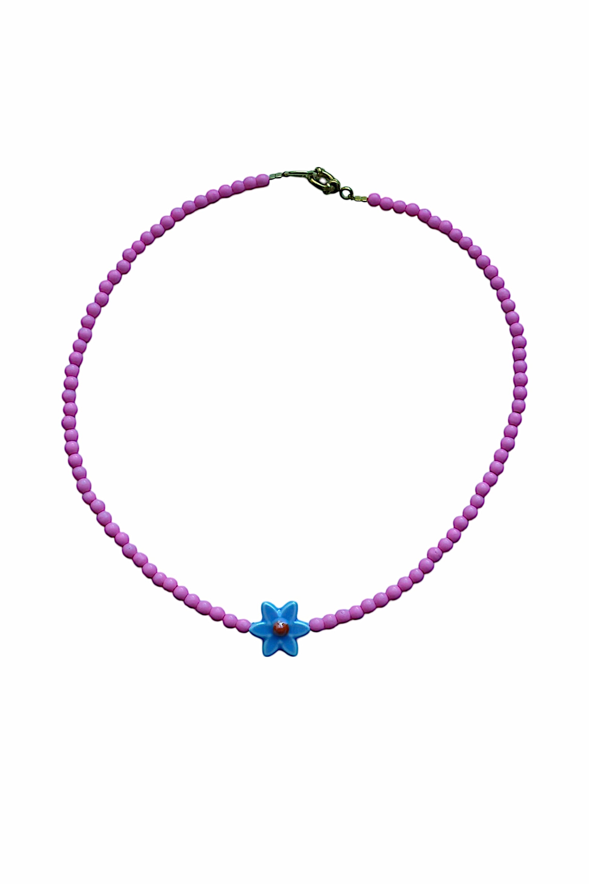 Handmade pink necklace with round beads and a delicate ceramic flower in soft blue. A dreamy summer piece for a feminine and floral look.