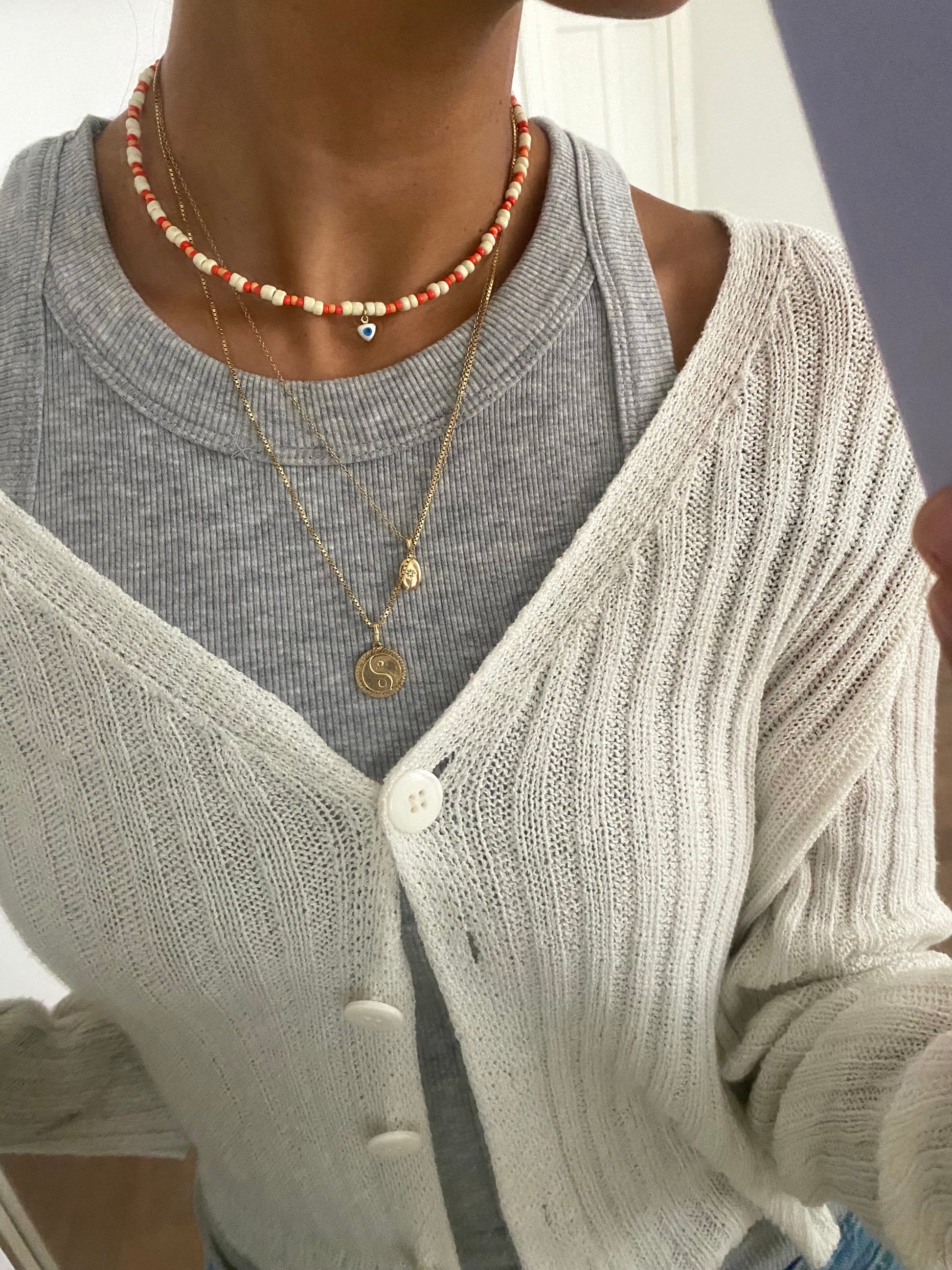 The beaded eye Necklace showcases a lovely combination of soft colors. Designed to be worn slightly shorter, it pairs beautifully with longer necklaces. At its center, a small 'protective eye' charm adds a unique touch. Finished with a 18k gold-plated stainless steel clasp.