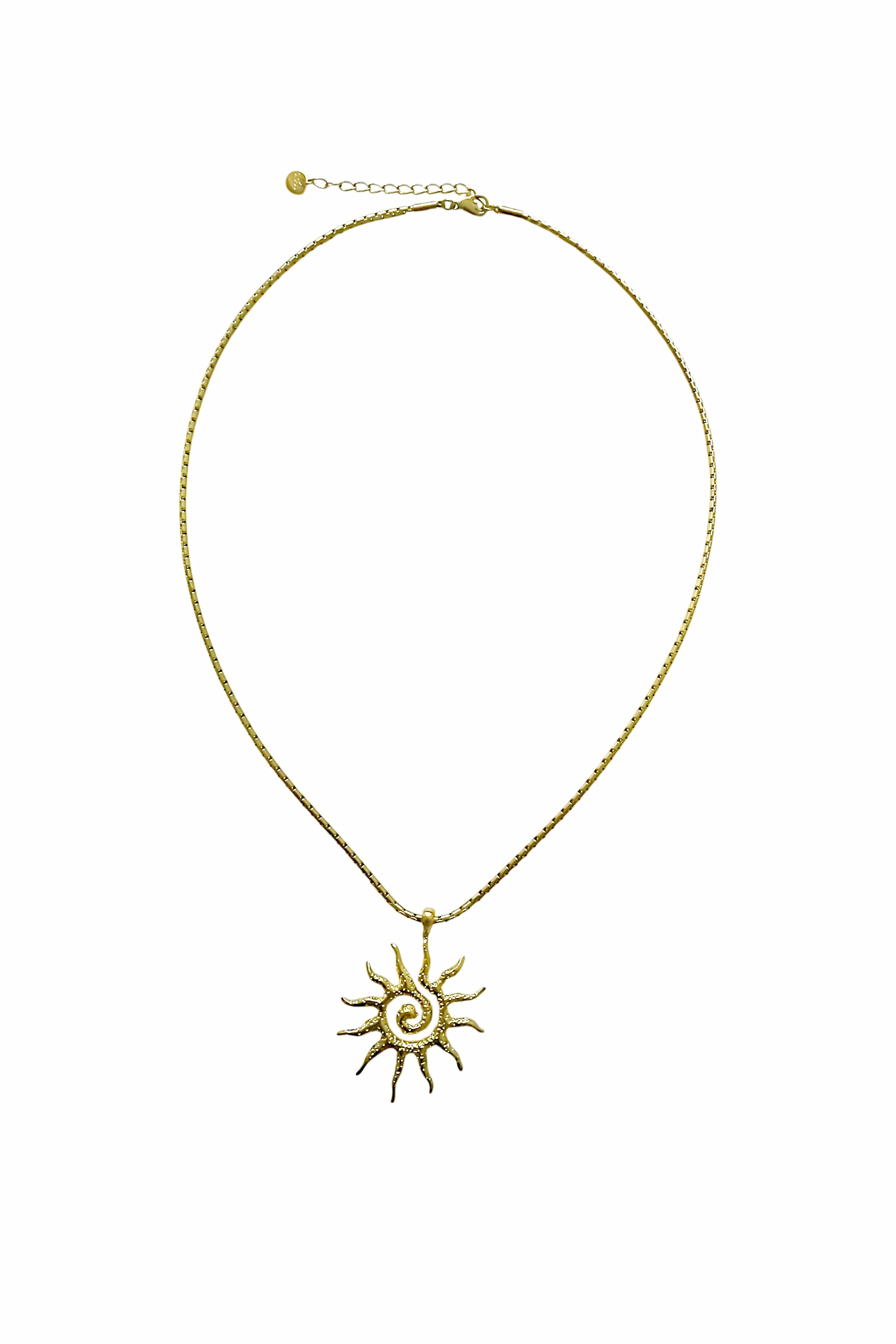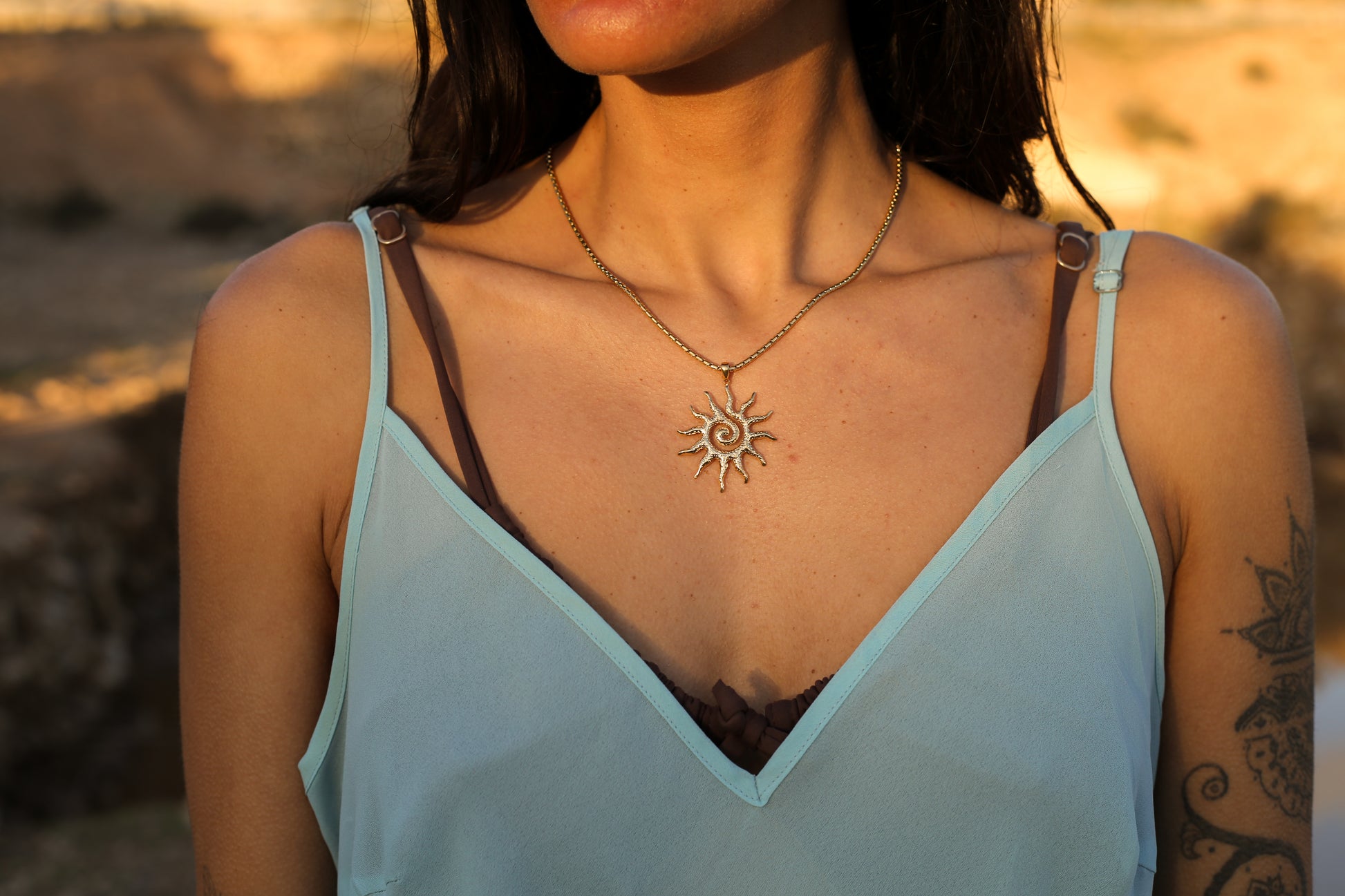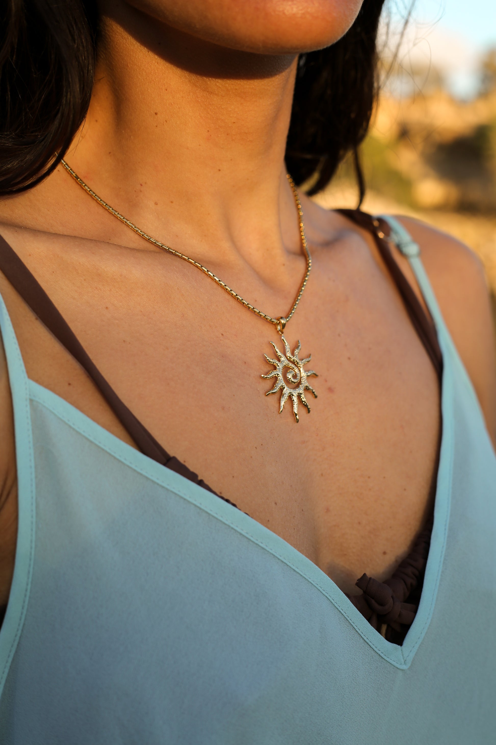 This beautiful sun necklace is made of stainless steel (non-tarnish) and coated with a layer of 18k gold plating.