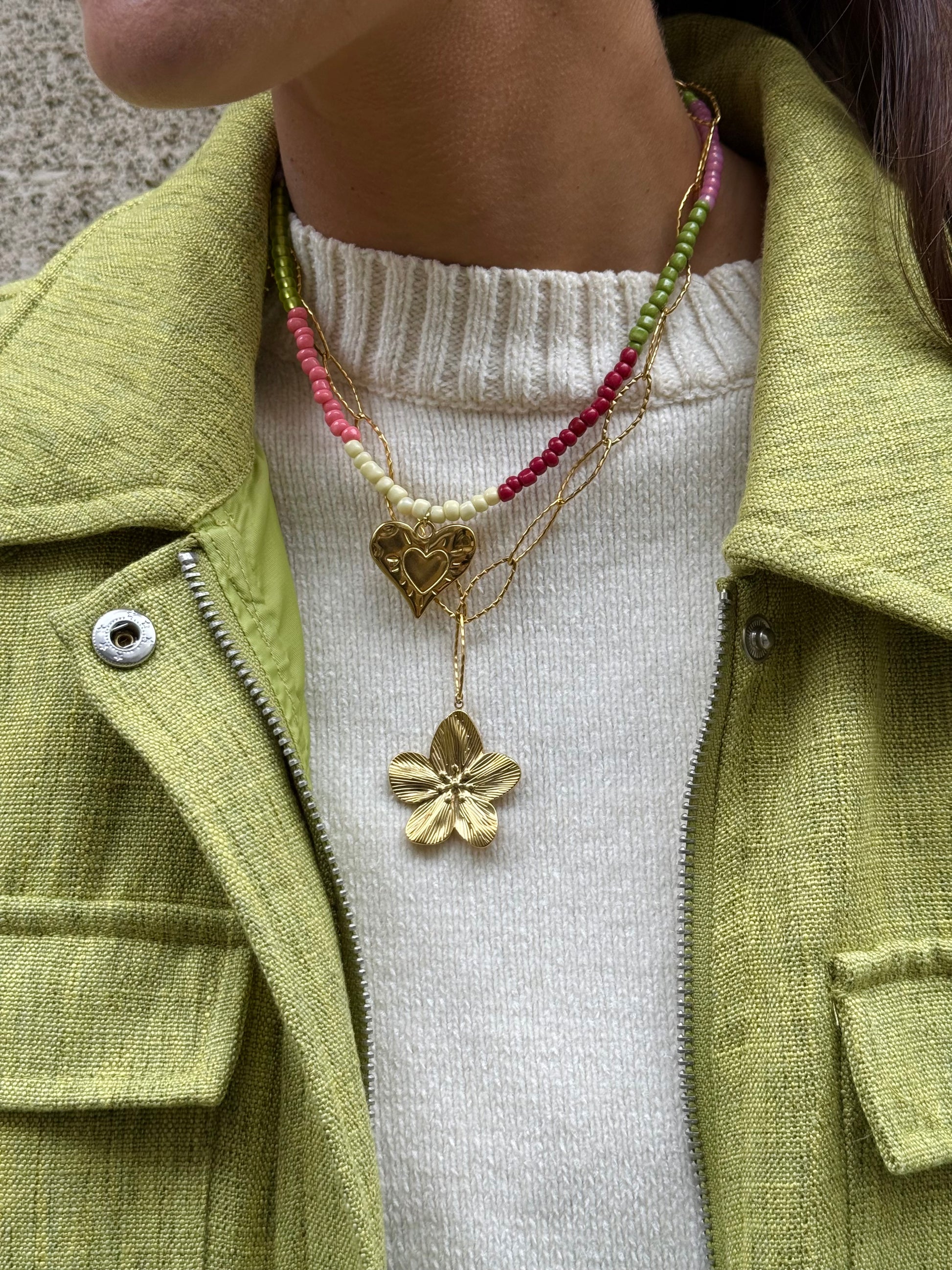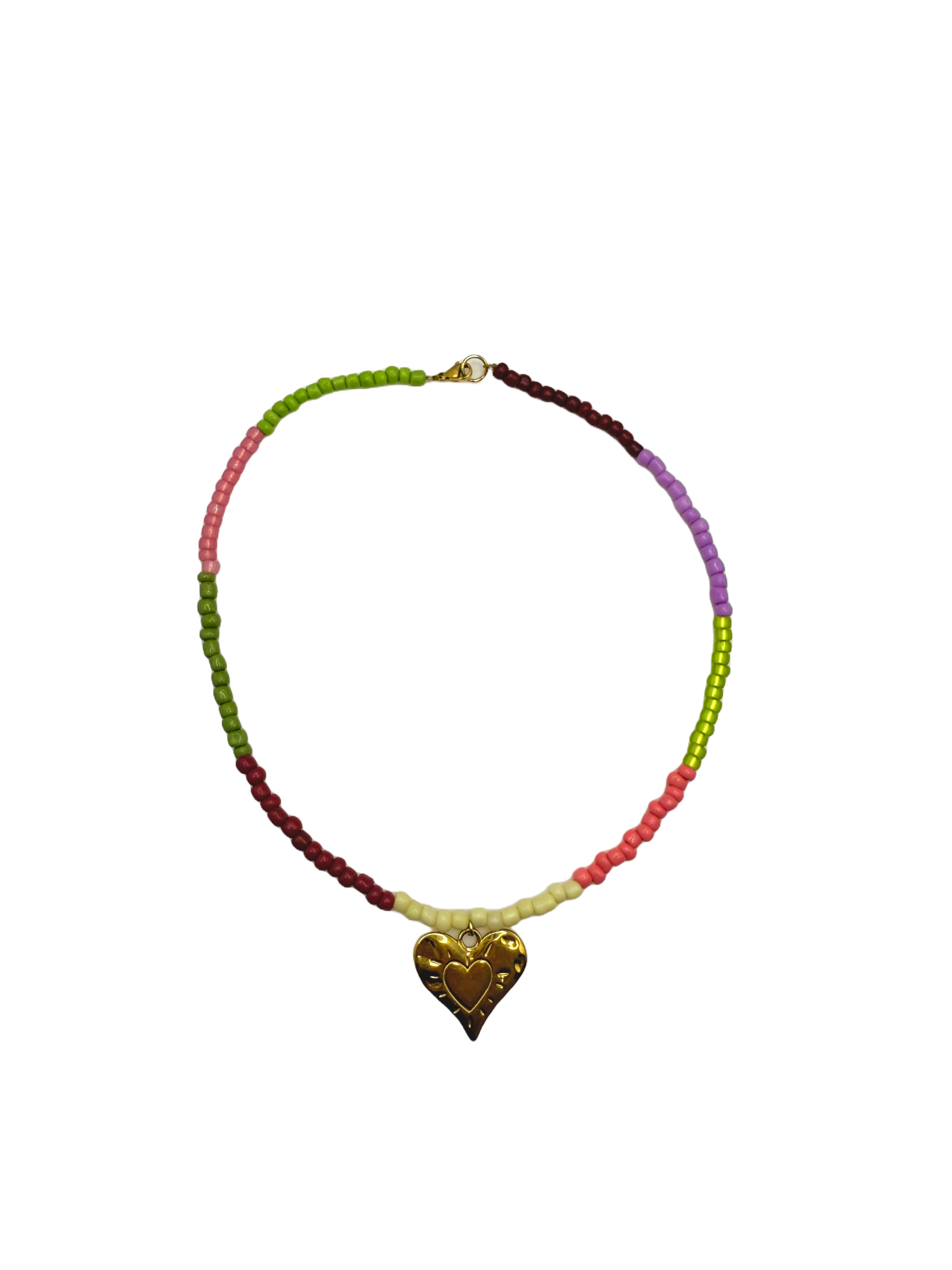 A fun mix of colorful beads with a stainless steel gold-plated clasp and heart charm. Perfect on its own or paired with our Golden Flower Necklace!